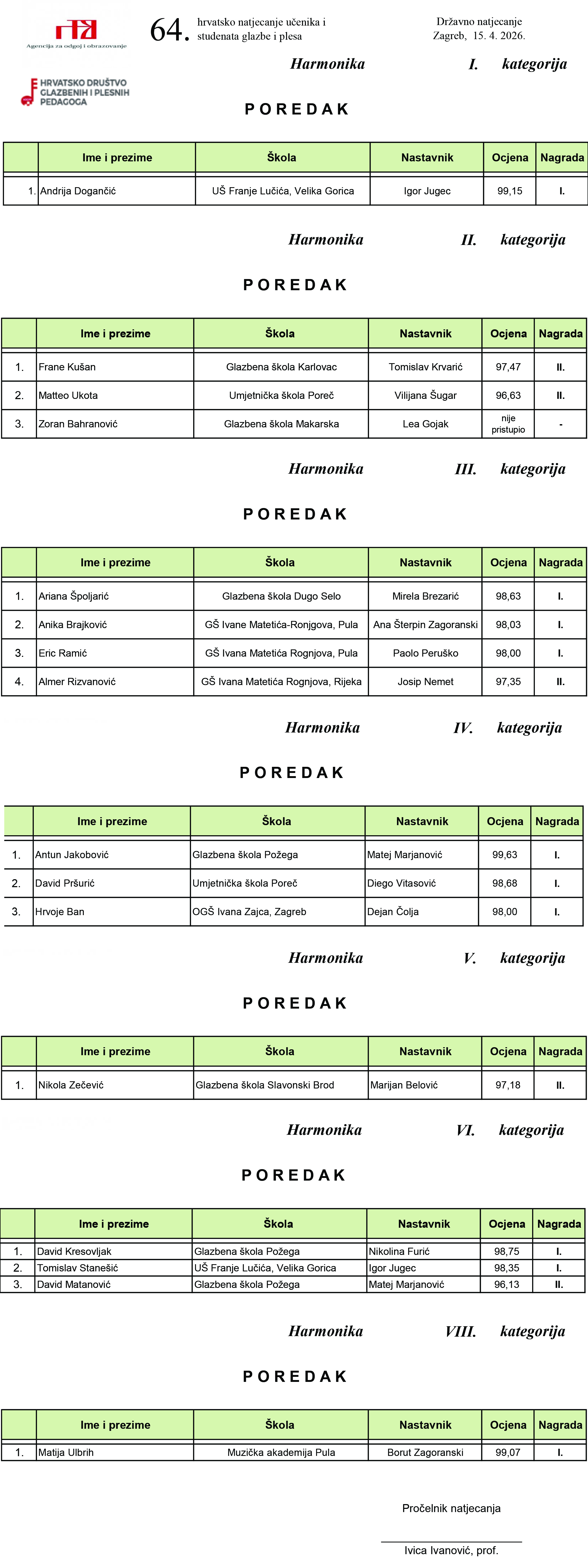 Rezultati 64. hrvatskog natjecanja učenika i studenata glazbe i plesa - disciplina HARMONIKA